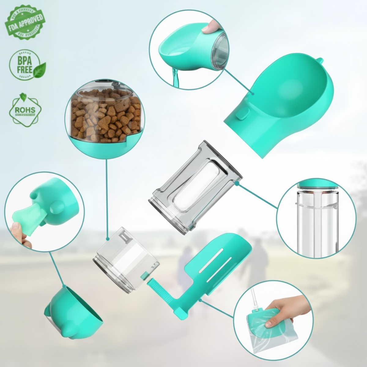 Il design 4-in-1 di PawZone™ offre una combinazione perfetta di borraccia per acqua, contenitore per cibo, porta sacchetti e paletta igienica. Questo supporta le tue esigenze durante passeggiate, escursioni e viaggi.